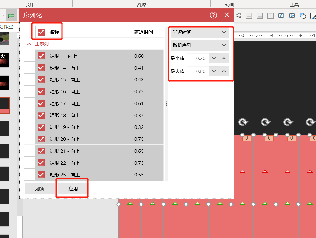 9、选择【动画时长】-【随机序列】-【最小值0.3,最大值0.3】-【勾选名称】-【应用】,如图10