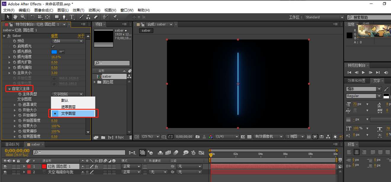 3.接下来就可以选择saber了,点击固态层(2019CC 为纯色图层),效果——video sopilot——saber,