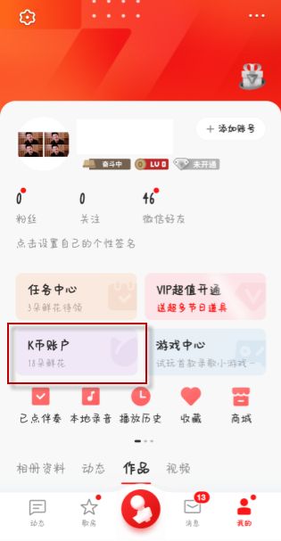 1、打开全民k歌app的我的界面,点击“k币账户”;