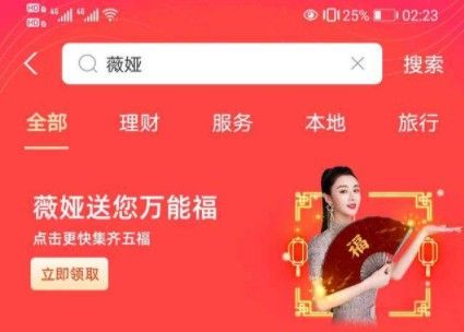 我们要获得薇娅这个万能福,非常简单的,我们打开支付宝之后在上面输入薇娅两个字,搜索结果里面就可以看到有个万能福,我们点击抽取就可以了。
