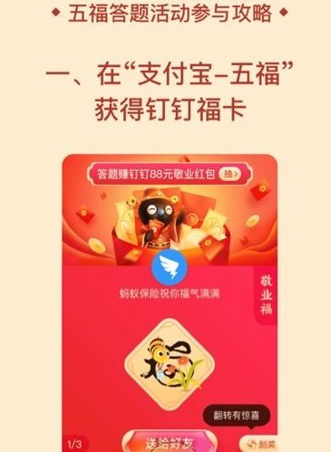 钉钉今年推出了五福答题活动,当用户获得钉钉福卡后,可参与答题,全部答对后,赢取88元的红包奖励!