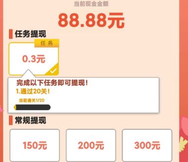 我下载一画到底红包版,在提现页面看到,有任务提现和常规提现。其中,任务提现,是指玩一画到底游戏,通过20关,就可以提现0.3元。常规提现,有150元、200元、300元,没有门槛及要求。