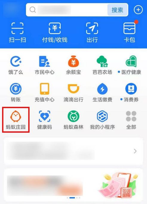 1、进入支付宝首页,在应用列表中找到蚂蚁庄园,点击进入;
