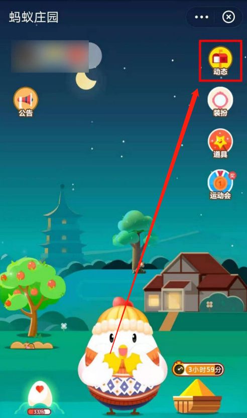 2、进入蚂蚁庄园主界面,毛衣小鸡在开心的双手吃饲料,点击右上角的动态;