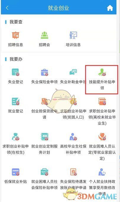 2、进入就业创业界面后,点击“技能提升补贴申领”