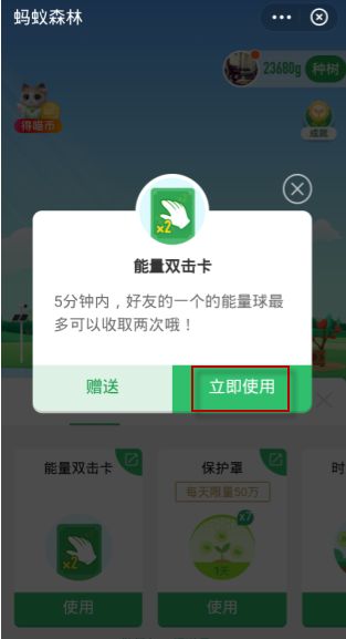 3、会弹出能量双击卡的功能,点击立即使用;