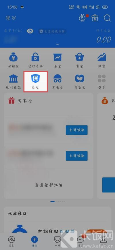 2、也可以通过【理财】页面,点击【保险】进入蚂蚁宝箱;