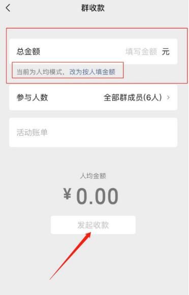 6、选择聊天群后,输入总金额、选择参与人数,点击“发起收款”即可,也可以点击“按人填写金额”,选择好友的付款金额,最后点击“发起收款”。