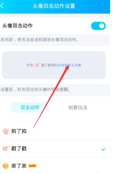 2、在“头像双击动作设置”界面中,点击“自定义文案”,然后就可以自己设置戳了戳的后缀显示了!