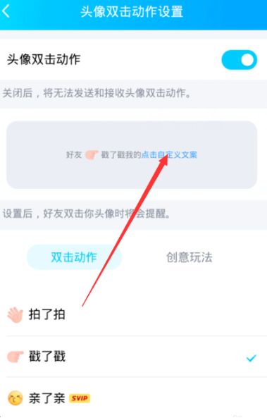 4、在这里点击“头像双击动作”后面的滑块,然后选择“戳了戳”开启,点击“自定义文案”,可以设置文字