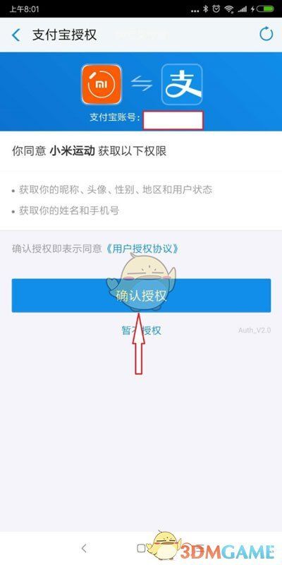 5、自动跳转到支付宝页面后,点击【确定授权】按钮,即可将小米运动和支付宝账号绑定。