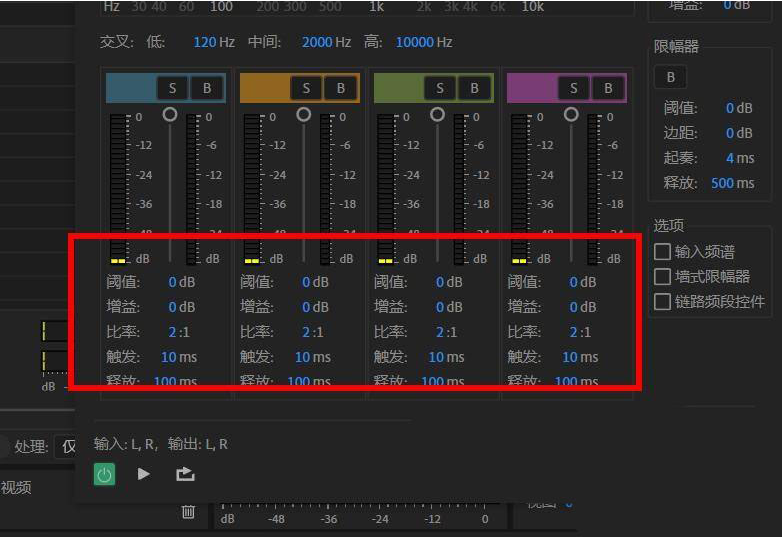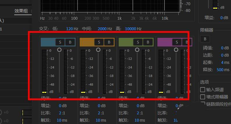 4.找到阈值、增益、比率、触发、释放选项进行数据更改,优化频段数值后即可完成对人声的美化