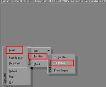 首先我们来进行系统的备份操作,我们点击Local,然后点击Partition,最后点击To Image,完成这一系列操作之后,我们就进入了操作系统的备份操作中。