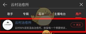 3、在搜索结果中切换到“用户”,全称为“云村治愈所”的用户,即为官方和志愿者组成的治愈服务号,点击此用户进入即可。