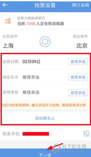 2、然后在进入了抢票设置的页面之后,去填写好自己想购买的火车票信息与乘车的席位要求,接着点击底端的“下一步”选项。