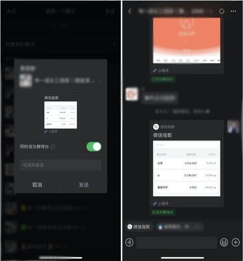 群成员在微信对话列表就会看到【群待办】的提示了,全部群成员都可以收到通知,打开小程序完成待办内容,输入框上方的小程序后面也会显示完成。转发时没有设置群待办的,分享到群后依然可以进行设置,群待办功能可以实时的查看群成员的完成状态。群主可以看到群成员有谁已经完成了这个内容。群主和管理员转发小程序可以设置群待办,群成员转发小程序会出现设为群待办选项,群主和管理员可对其进行设置。目前小程序和群公告支持设为群待办。