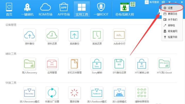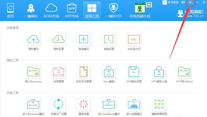 首先打开电脑中的奇兔刷机软件,然后在其界面右上角找到“菜单”按钮,如下图所示: