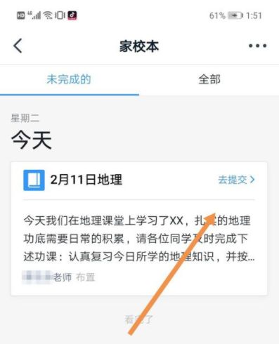 进入到“家校本”界面,找到你要提交的作业,点击“去提交”。