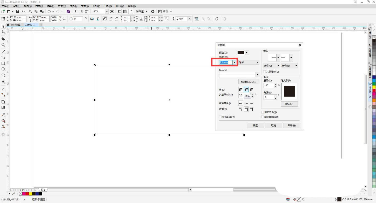 现在用鼠标左键点击右边的颜色更改矩形的颜色,再点击贝塞尔工绘制图形,按f12调出轮廓笔工具,调整轮廓粗细点击确定。