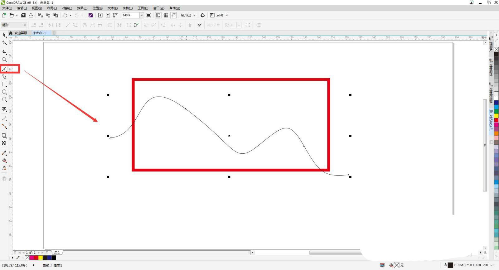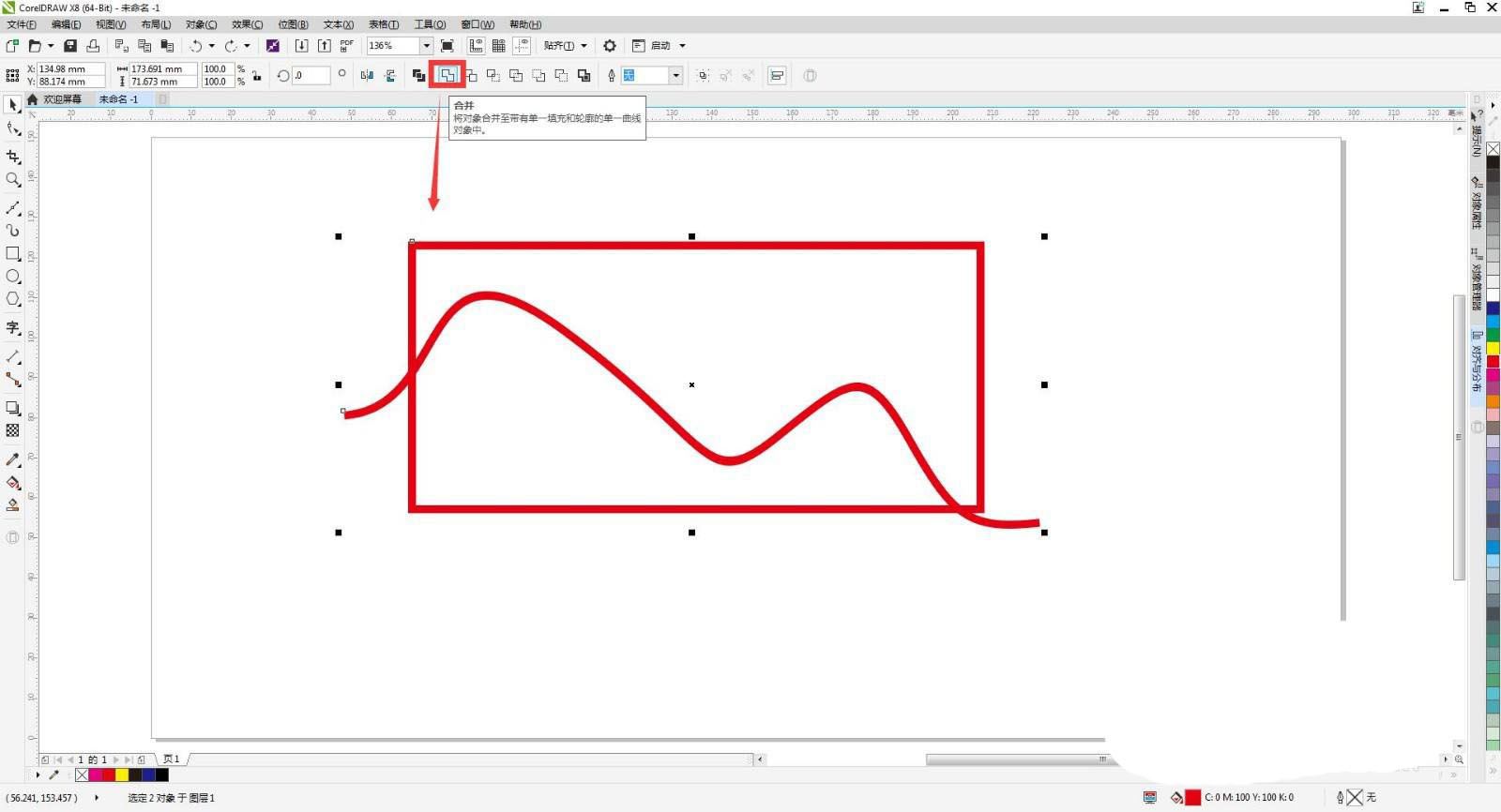 点击曲线按ctrl+shift+q键将轮廓转化为对象,再点击右边的颜色更改曲线颜色,现在框选两个图形点击合并,再点击形状工具或者按f10键把不要部分框选出来按delete键删除。