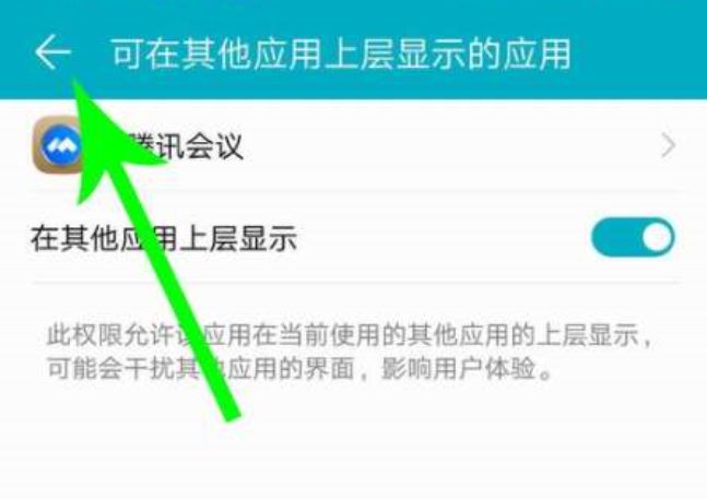 打开“可在其他应用上层显示的应用”设置界面,然后点击灰色“开关”按钮,按钮变成蓝色后点击“返回”图标。