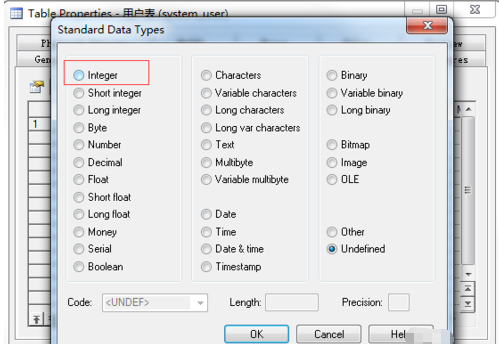 接着我们编辑主键数据类型。点中“Data Type”栏,点击“...”图标,在弹框中选择“Integer”类型,并点击“确认”,如下图所示:
