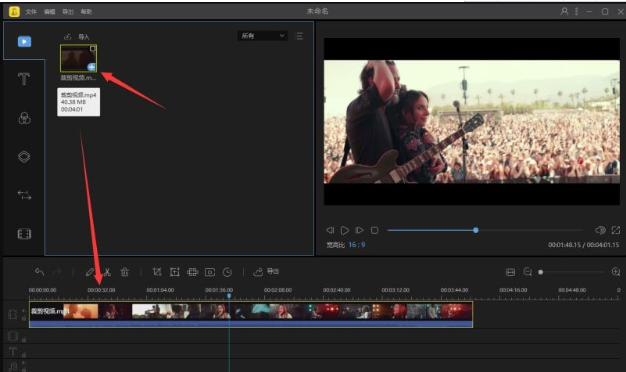 2、导入视频文件,点击视频素材中的“+”,将视频添加到轨道上;