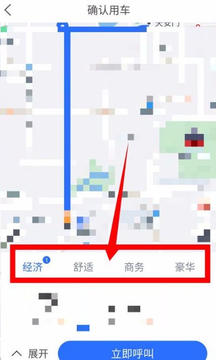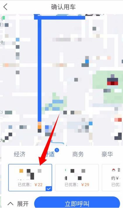 然后就会自动规划出一条线路,选择要打车的车型,在上面点击一下。如图所示