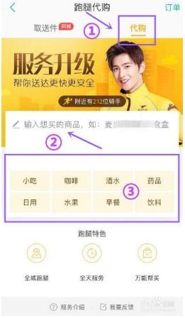 ①点击【代买】→②然后手动输入需要代买的商品名称→③选择代买商品类型
