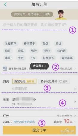 【填写订单】说明:①点击输入对商品的要求,比如糖炒板栗1斤 → ②是否需要元代付商品费用,送货时当面结算 → ③指定地址购买 →④地址/电话填写 →⑤提交订单