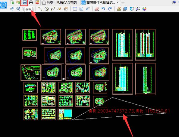 5.在使用鼠标框选出CAD图纸需要测量面积的部分,之后在点击回车键就可以测量出该区域图纸的面积是多少了,测量完成后还能点击上方中“保存”按钮将CAD图纸进行保存。