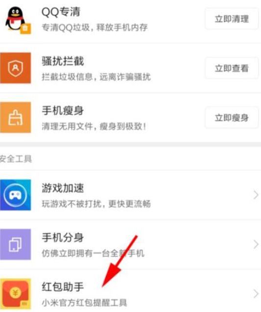 第二步:进入安全中心之后下拉该界面,找到【红包助手】选项,点击打开,