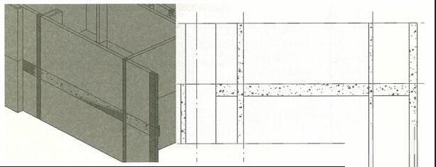 如果按以往的简化做法,墙体只考虑核心层,除了未能完整表达墙体构造的缺点外,也有图面表达的问题,主要是影响到立剖面的表达,立剖面上的梁、板、柱等结构构件边线会显露出来,带来大量的线处理工作,如图所示: