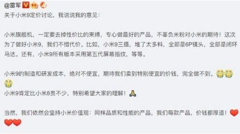 雷军在微博表示:小米旗舰机,一定要去掉性价比的束缚。因成本原因,小米9肯定比小米8贵不少(据传低配2999起步)。