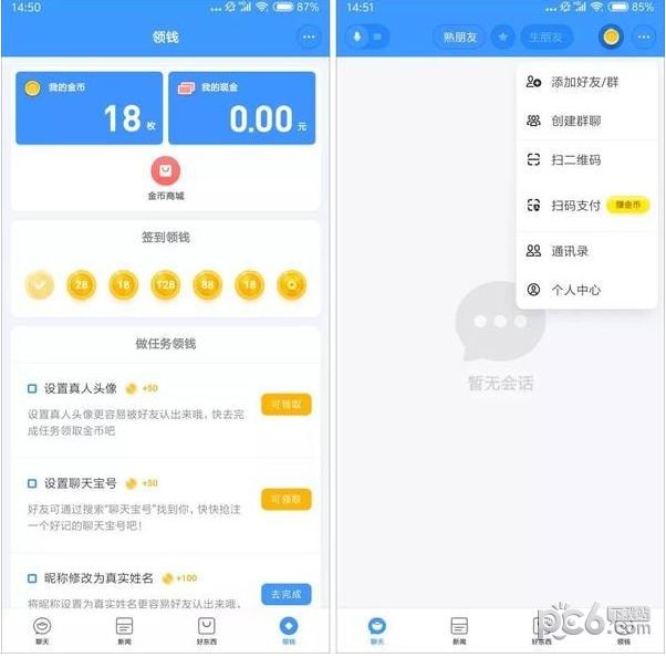 中国移动聊天宝的【首页】界面下方共有4个导航栏图标,分别为聊天、新闻、好东西、领钱。