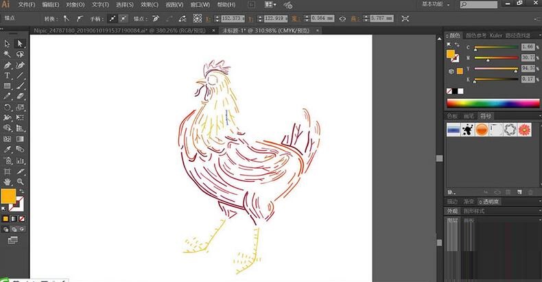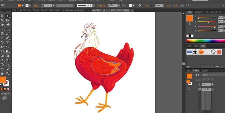 2、使用橙色、桔红色、暗红色、黄色分别填充公鸡身体表面的线条路径,通过过渡色让公鸡身体表面的色彩层次更加的丰富。