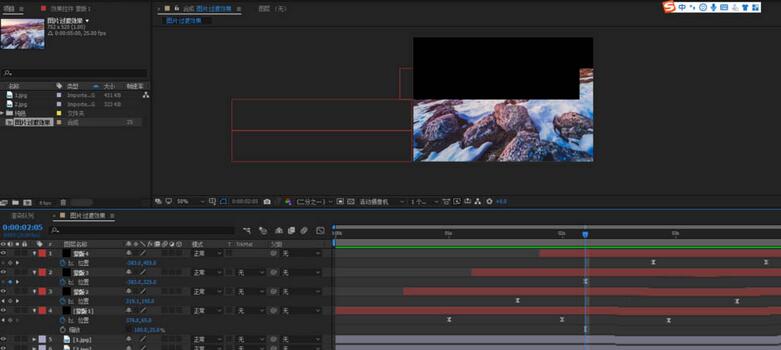 5、回到两秒处,选择蒙版1,ctrl+d复制纯色层,命名为蒙版2,选中蒙版2按下u键,调用出所有关键帧,选中所有关键帧,将蒙版2往下移动,将他和蒙版1进行上下拼接,同理复制得到蒙版3,同理操作将其和蒙版2进行上下的拼接;这样三个纯色层蒙版就把整个画布进行了无缝覆盖了,这样基本有了一个幻灯片切换的效果了;蒙版4同理操作;