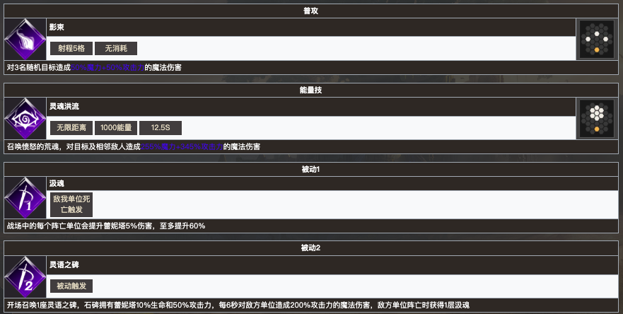 这个角色的四大技能分别是影束,灵魂洪流,汲魂和灵语之碑,而这四大技能,不仅实现攻防兼备,还有着非常强的远近交替战,在团队中也能做到法术伤害成吨提高,是一个免费可得的超优质角色。