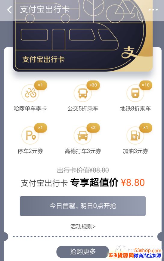 成功购买支付宝出行卡后,单车券需要点击卡片页面里的“单车权益”按钮进行兑换激活,而之后所有的优惠券就会在支付宝的“卡包”界面里显示。另外乘车优惠权益的有效期为90天,过期失效哦!