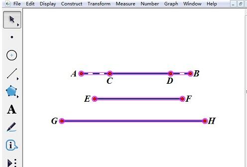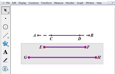 首先要在几何画板中绘制一些图形,这里绘制四条线段,来演示选择功能,单击侧边栏“线段直尺工具”,先绘制一条线段AB,然后在AB的上面在画一条线段CD,然后再绘制两条线段EF和GH,如下图所示。
