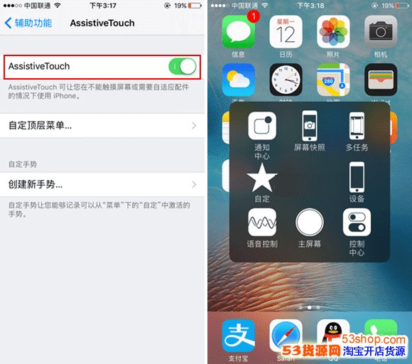 3、最后开启右侧的滑动按钮即可开启,此时屏幕上即会出现虚拟HOME键,而我们就可以任意拖动小白点在界面中显示位置,点击小白点会弹出主屏幕、控制中心、设备、个人收藏夹等设置操作,如下图所示。