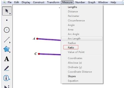 1.用侧边栏“移动箭头工具”依次选中两条线段,单击上方菜单栏“度量”菜单,在其下拉选项选择“比”命令,如图所示。