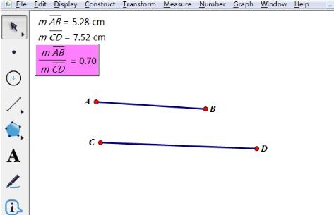 2.执行了以上操作后,就可以看到在画板左上角显示出了线段的比值,如图所示。这样就能一目了然的知道线段之间的比值。