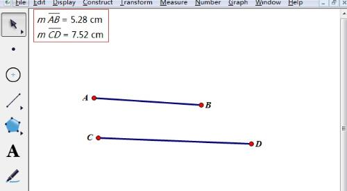 1.还是和上面一样,用“线段工具”在几何画板中画线段AB、CD,分别选中线段,点击上方菜单栏“度量”菜单,在其下拉选项选择“长度”命令,这样就能将线段AB和CD的长度度量出来,如下图左上角所示。