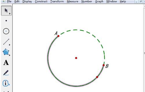 在圆上画虚线。执行了以上命令后,就会构造出圆上的弧AB,除了弧AB的部分,剩下的都会以虚线显示,以便和弧AB进行区分,这样就在圆上绘制出了虚线。