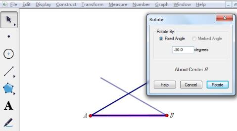 以点B为旋转中心旋转线段AB。选择移动工具双击点B,标记点B为旋转中心,然后用移动工具单击线段AB的线的部分,这时线段AB被选中,在变换菜单下执行旋转命令,弹出旋转对话框,将度数改为-30度,然后单击旋转。