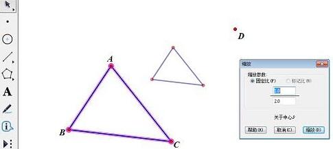2.缩放三角形。单击移动箭头工具,双击点D,将点D设为缩放中心。同时选中△ABC的三条边和三个顶点,执行“变换”—“缩放”命令,打开缩放对话框,单击缩放按钮,得到新三角形A’B’C。