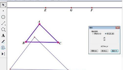 缩放三角形。依次选中点E、G、F,执行“变换”—“标记比”命令,将EF/EG设为标记比。同时选中△ABC的三条边和三个顶点,执行“变换”—“缩放”命令,打开缩放对话框,单击缩放按钮,得到新三角形A’B’C。
