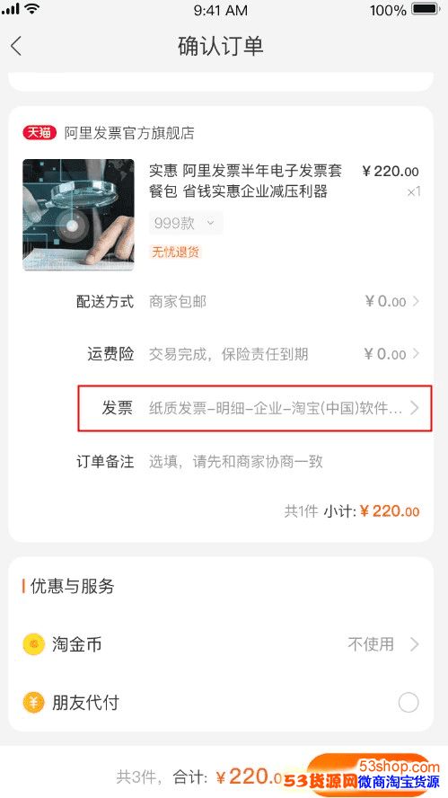 (一) 商品“下单环节在线申请发票”,是指消费者通过天猫在线购买特定商品时,在商品下单环节,选择开票,如下图: