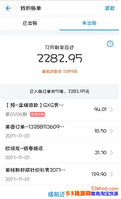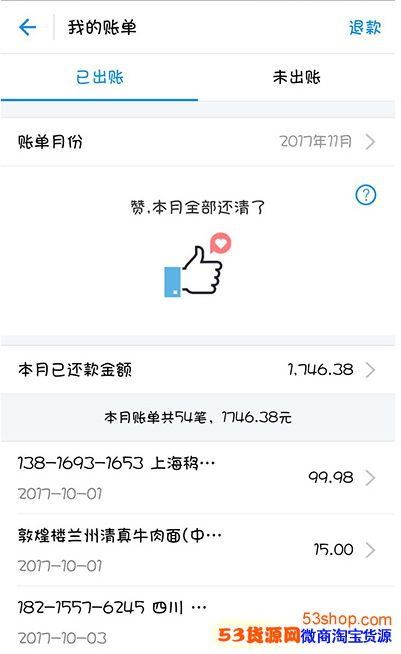 3、这时候将会出现“已出账单”和“未出账单”,当期的直接选择还款就行了,未出账单会在每个月的1号进行结算,当然也可以选择提前还款。